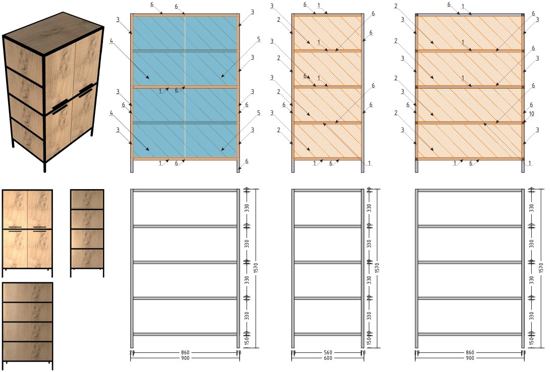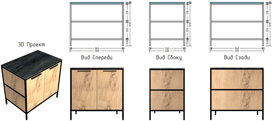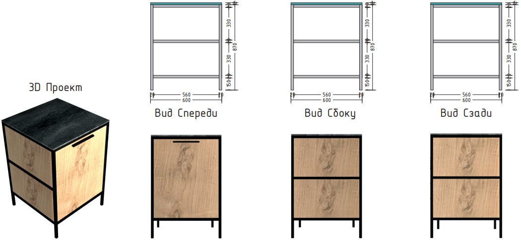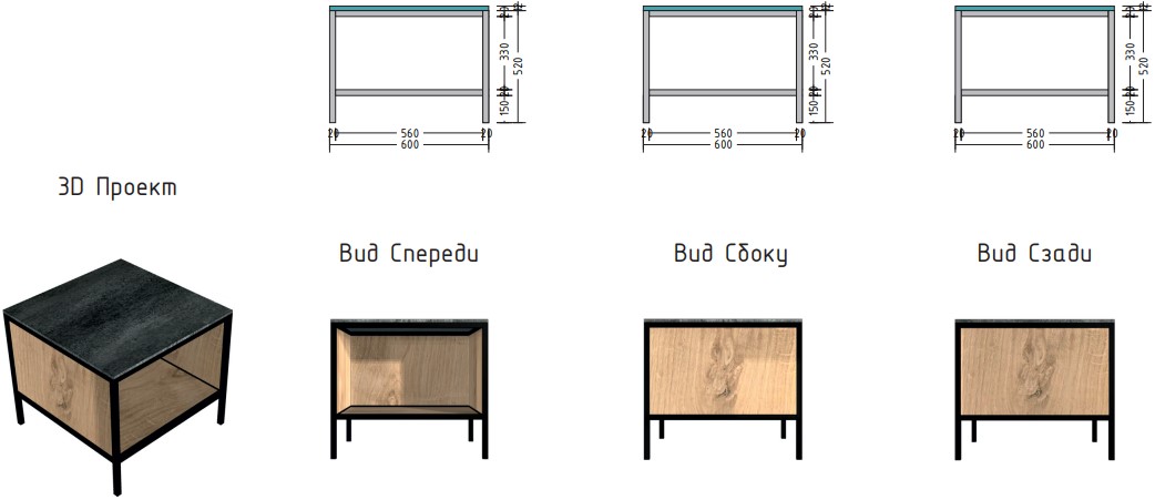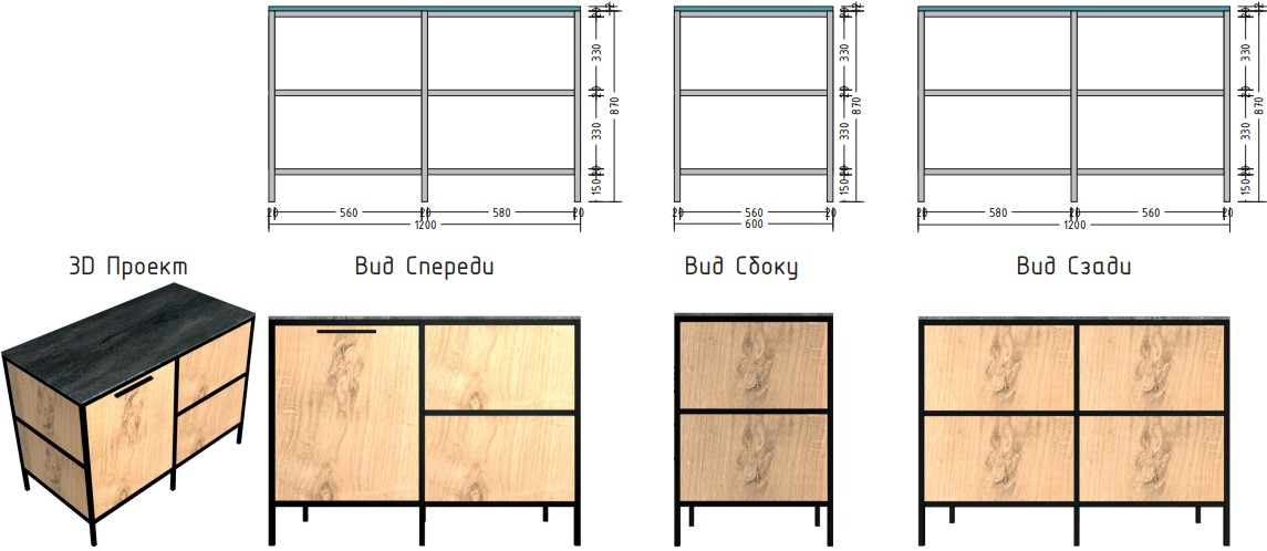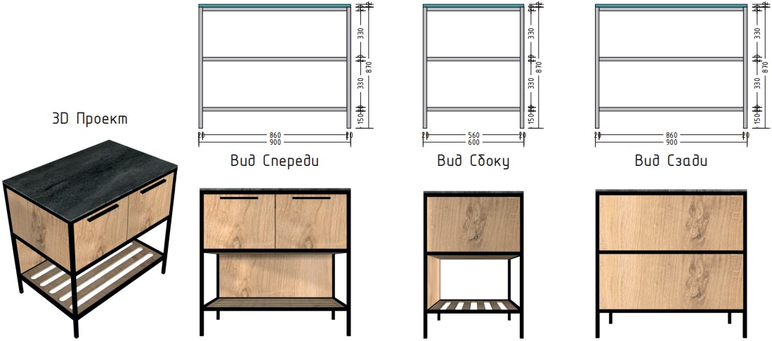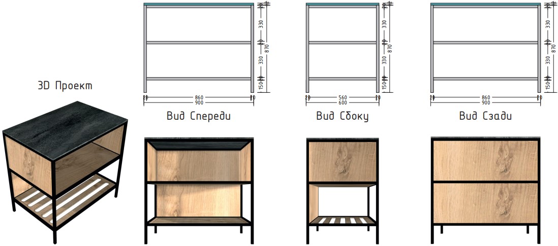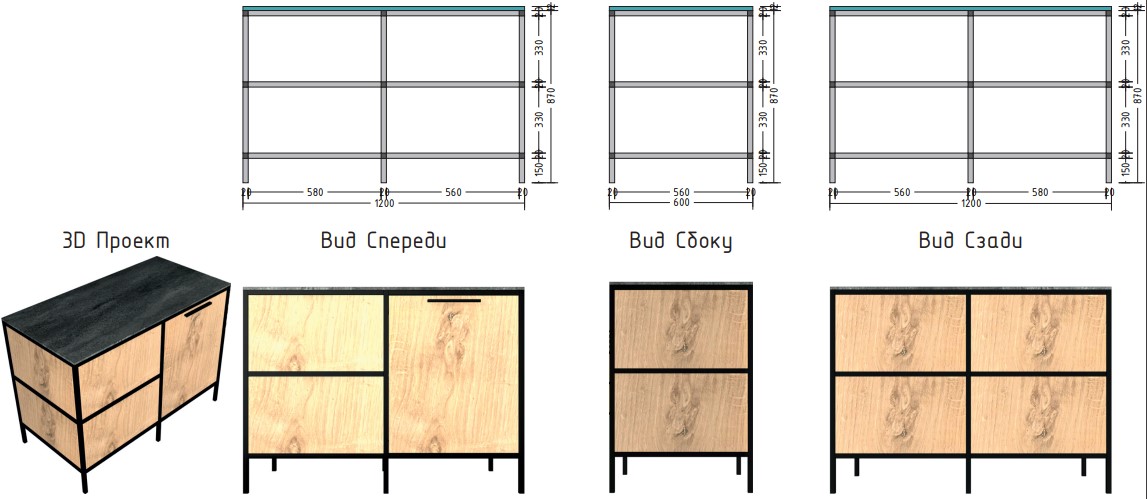 Материал столешницы Шунгит повторяет текстуру камня, древесный Ирландский дуб используется для каркаса и фасадов. В дальнейшем палитра цветов и ассортимент модулей будут расширяться.